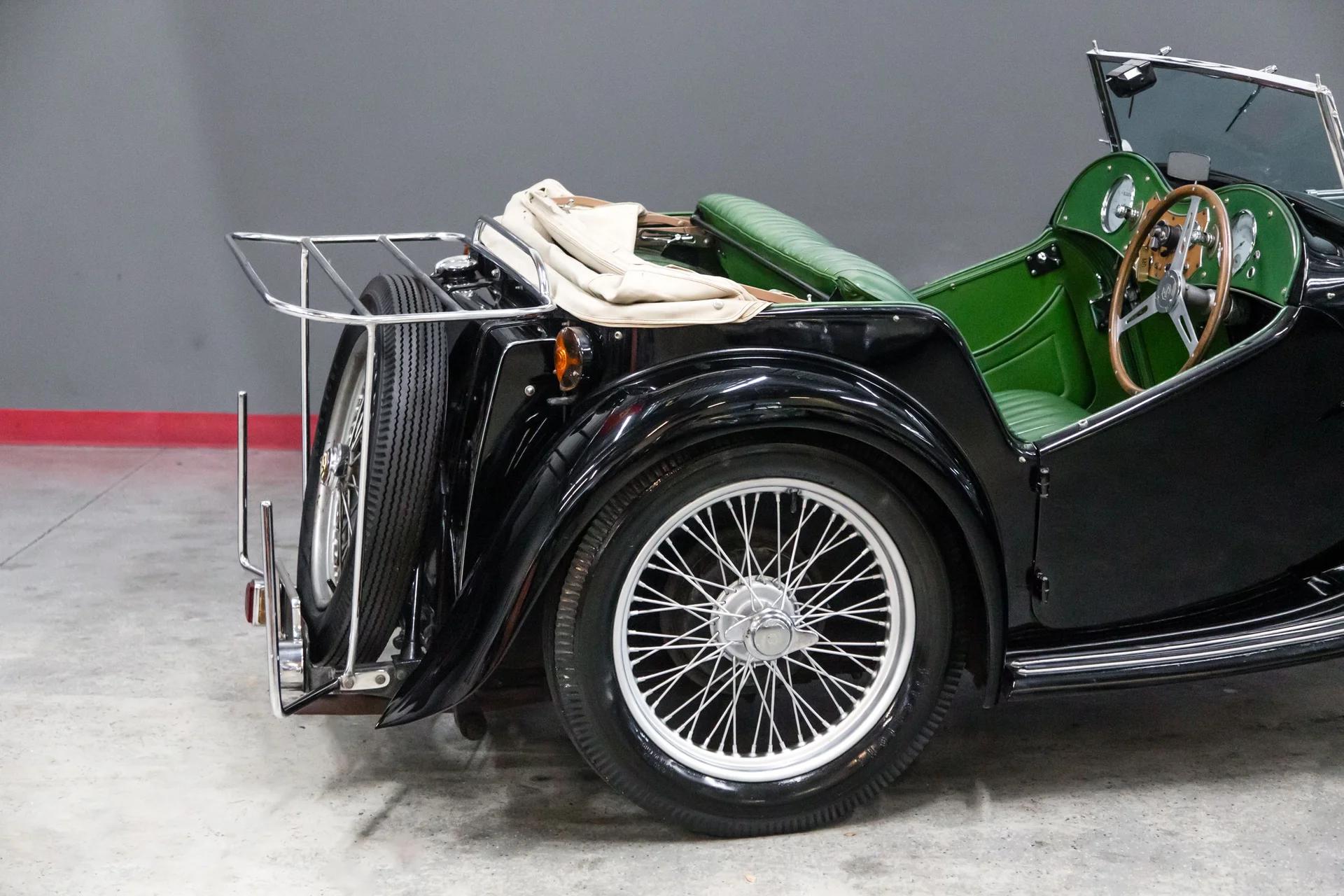 This beautiful black over green MGTC drives as nice as it looks. The car has excellent chrome ,nice leather, carpets, door cards ,and gauges .The paint is as nice as the pictures reflect. The wings are straight with no rust or accident history. The doors are tight ,wood in the tub is solid. The car hails from California and is not a victim of rust or accident history. The car will come with a new top or credit will be given for your choice of color.