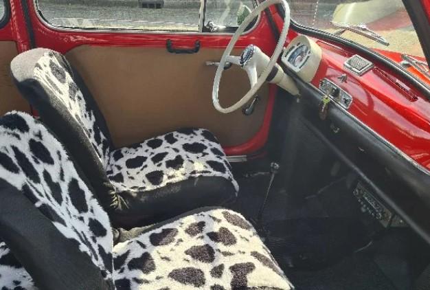 De auto is voorzien van een werkende Blauwpunkt radio en uitdagende koeienprint hoezen op de stoelen.